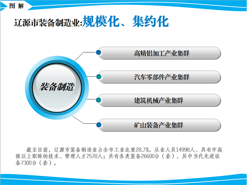 遼源市裝備制造業(yè)經(jīng)過多年的建設(shè)與發(fā)展,現(xiàn)已呈現(xiàn)出產(chǎn)業(yè)集群規(guī)模化、集約化發(fā)展態(tài)勢(shì)。截至目前,遼源市裝備制造業(yè)占全市工業(yè)比重28.7%。從業(yè)人員14998人、具有中高級(jí)以上職稱的技術(shù)、管理人才2570人;共有各類裝備26600臺(tái)(套),其中當(dāng)代先進(jìn)設(shè)備7300臺(tái)(套)。